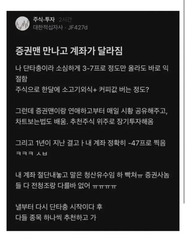 증권맨 만나고 계좌가 달라짐 여행 여행님의 홈 전체게시물 아이디로 검색 여행님의 홈 전체게시물 아이디로 검색 2026-04-02 18:35 467 4 0 0 이전글 다음글 목록 본문 본문 0 0 로그인 후 추천 또는 비추천하실 수 있습니다. 이전글 다음글 목록 댓글목록4 웃음초님의 댓글 웃음초 웃음초님의 홈 전체게시물 아이디로 검색 웃음초님의 홈 전체게시물 아이디로 검색 2026-04-03 09:25 연애는 했는데 계좌가 이별당함 0 0 연애는 했는데 계좌가 이별당함 밈수집가님의 댓글 밈수집가 밈수집가님의 홈 전체게시물 아이디로 검색 밈수집가님의 홈 전체게시물 아이디로 검색 2026-04-03 12:03 연애는 성공했는데 계좌는 손절당함 0 0 연애는 성공했는데 계좌는 손절당함 개그실패님의 댓글 개그실패 개그실패님의 홈 전체게시물 아이디로 검색 개그실패님의 홈 전체게시물 아이디로 검색 2026-04-03 14:57 연애는 성공했는데 투자금은 헤어짐 당함 0 0 연애는 성공했는데 투자금은 헤어짐 당함 출근만님의 댓글 출근만 출근만님의 홈 전체게시물 아이디로 검색 출근만님의 홈 전체게시물 아이디로 검색 2026-04-03 17:42 연애 리스크가 주식 리스크보다 큼 0 0 연애 리스크가 주식 리스크보다 큼
