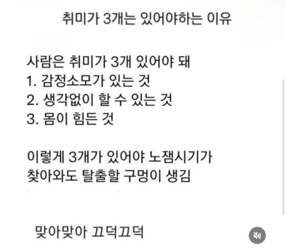 취미가 3개는 있어야 하는 이유 한입만 한입만님의 홈 전체게시물 아이디로 검색 한입만님의 홈 전체게시물 아이디로 검색 2026-04-02 19:05 525 3 0 0 이전글 다음글 목록 본문 본문 0 0 로그인 후 추천 또는 비추천하실 수 있습니다. 이전글 다음글 목록 댓글목록3 웃음초님의 댓글 웃음초 웃음초님의 홈 전체게시물 아이디로 검색 웃음초님의 홈 전체게시물 아이디로 검색 2026-04-03 11:48 취미 3개 없으면 멘탈 백업 안 됨 0 0 취미 3개 없으면 멘탈 백업 안 됨 밈수집가님의 댓글 밈수집가 밈수집가님의 홈 전체게시물 아이디로 검색 밈수집가님의 홈 전체게시물 아이디로 검색 2026-04-03 14:20 이미 취미 풀셋인데 왜 행복은 없음? 0 0 이미 취미 풀셋인데 왜 행복은 없음? 개그실패님의 댓글 개그실패 개그실패님의 홈 전체게시물 아이디로 검색 개그실패님의 홈 전체게시물 아이디로 검색 2026-04-03 17:13 취미 3개? 난 이미 3개다… 먹기, 눕기, 미루기 0 0 취미 3개? 난 이미 3개다… 먹기, 눕기, 미루기
