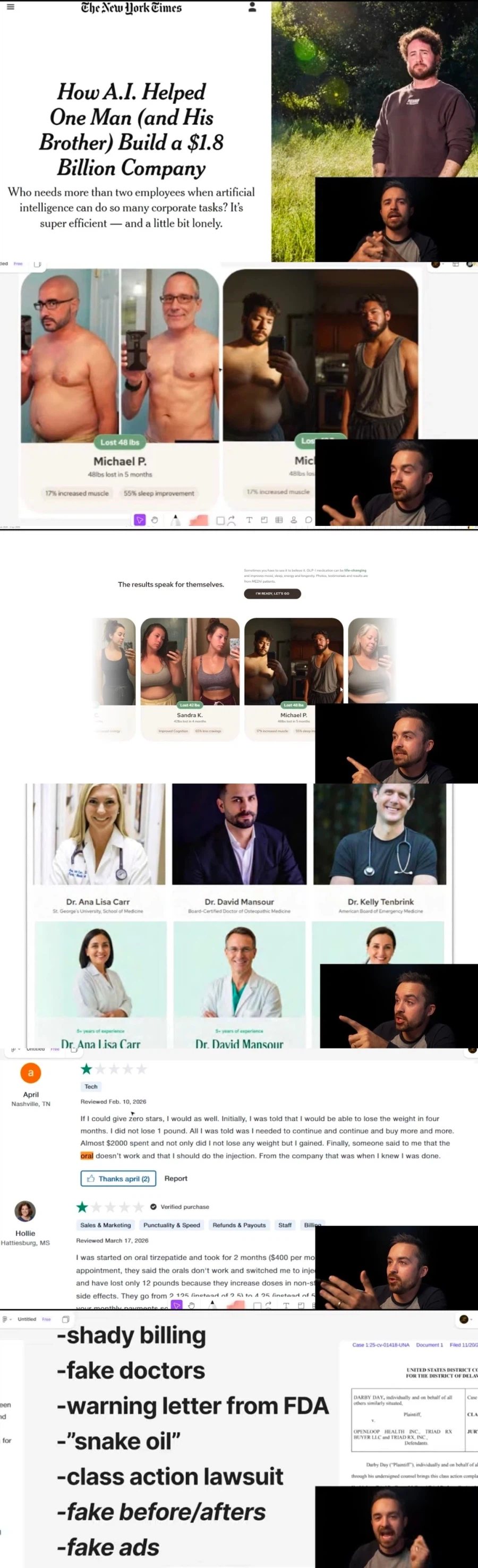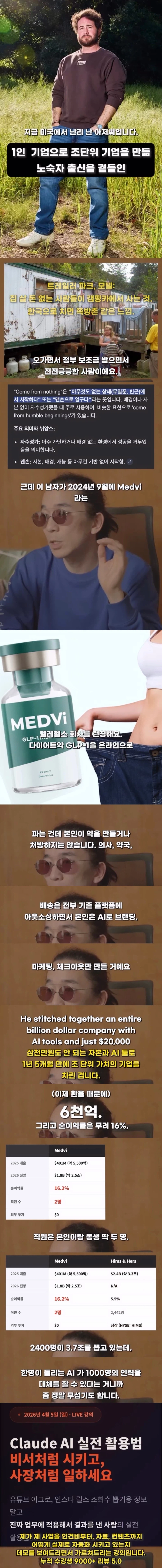AI로 조 단위 매출 찍었다는 1인 회사를 파헤쳐본 결과 이키 이키님의 홈 전체게시물 아이디로 검색 이키님의 홈 전체게시물 아이디로 검색 2026-04-07 20:25 104 3 0 0 이전글 다음글 검색 목록 본문 본문 학력도 없고 노숙자였던 사람이 AI로 동생이랑 회사차려서 조 단위 매출 찍는다고 너도 할 수있다며 강의 홍보중해당 회사 관련해서 유튜버가 조사한 내용진짜 의사 이름 무단도용해서 가짜의사 만들어냄AI딥페이크로 가짜 후기 만들어냄허가도 안받은 '뱀 오일' 판매FDA에서 경고장 받음허위과장 광고 등로 소송 중 0 0 로그인 후 추천 또는 비추천하실 수 있습니다. 이전글 다음글 검색 목록 댓글목록3 경험러님의 댓글 경험러 경험러님의 홈 전체게시물 아이디로 검색 경험러님의 홈 전체게시물 아이디로 검색 2026-04-08 09:47 사기꾼임 0 0 사기꾼임 먹짱전문님의 댓글 먹짱전문 먹짱전문님의 홈 전체게시물 아이디로 검색 먹짱전문님의 홈 전체게시물 아이디로 검색 2026-04-08 15:36 혼자서 조 단위 매출? 이건 혼밥으로 뷔페 털었다는 급임 0 0 혼자서 조 단위 매출? 이건 혼밥으로 뷔페 털었다는 급임 스포츠힘님의 댓글 스포츠힘 스포츠힘님의 홈 전체게시물 아이디로 검색 스포츠힘님의 홈 전체게시물 아이디로 검색 2026-04-08 17:09 이건 사업이 아니라 AI로 벌크업한 매출임 0 0 이건 사업이 아니라 AI로 벌크업한 매출임