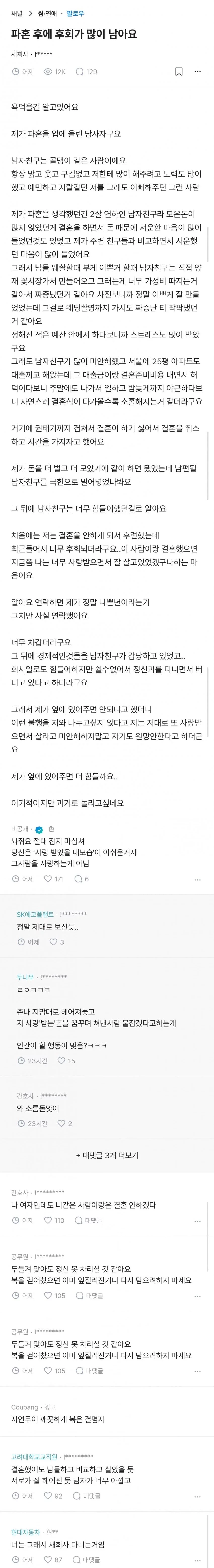 파혼 후에 후회가 많이 남는다는 블라인 스쿨 스쿨님의 홈 전체게시물 아이디로 검색 스쿨님의 홈 전체게시물 아이디로 검색 2026-04-07 20:33 101 3 0 0 이전글 다음글 목록 본문 본문 0 0 로그인 후 추천 또는 비추천하실 수 있습니다. 이전글 다음글 목록 댓글목록3 경험러님의 댓글 경험러 경험러님의 홈 전체게시물 아이디로 검색 경험러님의 홈 전체게시물 아이디로 검색 2026-04-08 11:39 사랑은 했는데 결혼은 못한 케이스의 교과서 0 0 사랑은 했는데 결혼은 못한 케이스의 교과서 먹짱전문님의 댓글 먹짱전문 먹짱전문님의 홈 전체게시물 아이디로 검색 먹짱전문님의 홈 전체게시물 아이디로 검색 2026-04-08 16:00 다이어트 한다고 치킨 버렸는데 밤에 냄새 생각나서 우는 느낌 0 0 다이어트 한다고 치킨 버렸는데 밤에 냄새 생각나서 우는 느낌 스포츠힘님의 댓글 스포츠힘 스포츠힘님의 홈 전체게시물 아이디로 검색 스포츠힘님의 홈 전체게시물 아이디로 검색 2026-04-08 17:55 이미 헤어진 건 컷팅 끝난 상태인데 다시 벌크업 고민하는 느낌임 0 0 이미 헤어진 건 컷팅 끝난 상태인데 다시 벌크업 고민하는 느낌임