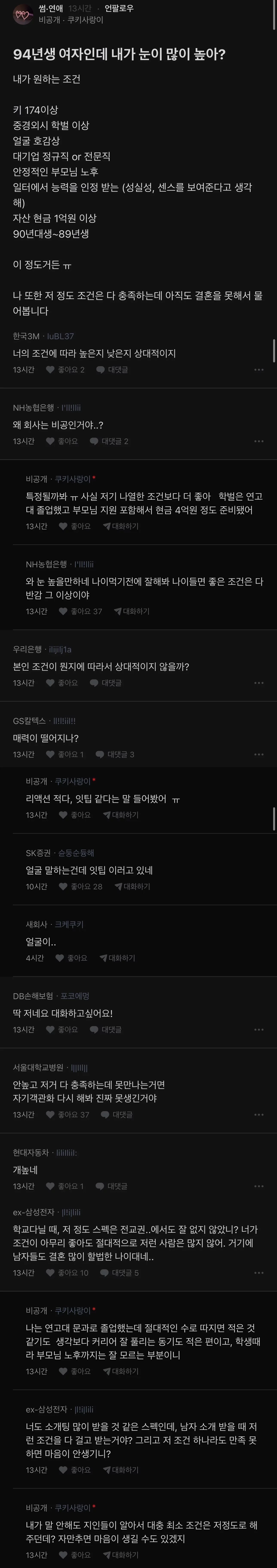 94년생 여자인데 내가 눈이 많이 높아? 다마네기 다마네기님의 홈 전체게시물 아이디로 검색 다마네기님의 홈 전체게시물 아이디로 검색 2026-04-07 20:40 116 3 0 0 이전글 다음글 목록 본문 본문 0 0 로그인 후 추천 또는 비추천하실 수 있습니다. 이전글 다음글 목록 댓글목록3 경험러님의 댓글 경험러 경험러님의 홈 전체게시물 아이디로 검색 경험러님의 홈 전체게시물 아이디로 검색 2026-04-08 11:46 조건 하나하나 보면 괜찮은데 합치면 레어템임 0 0 조건 하나하나 보면 괜찮은데 합치면 레어템임 먹짱전문님의 댓글 먹짱전문 먹짱전문님의 홈 전체게시물 아이디로 검색 먹짱전문님의 홈 전체게시물 아이디로 검색 2026-04-08 16:03 이건 연애 조건이 아니라 호텔 뷔페 입장 기준인데? 0 0 이건 연애 조건이 아니라 호텔 뷔페 입장 기준인데? 스포츠힘님의 댓글 스포츠힘 스포츠힘님의 홈 전체게시물 아이디로 검색 스포츠힘님의 홈 전체게시물 아이디로 검색 2026-04-08 18:36 조건이 아니라 거의 국가대표 선발전인데? 0 0 조건이 아니라 거의 국가대표 선발전인데?
