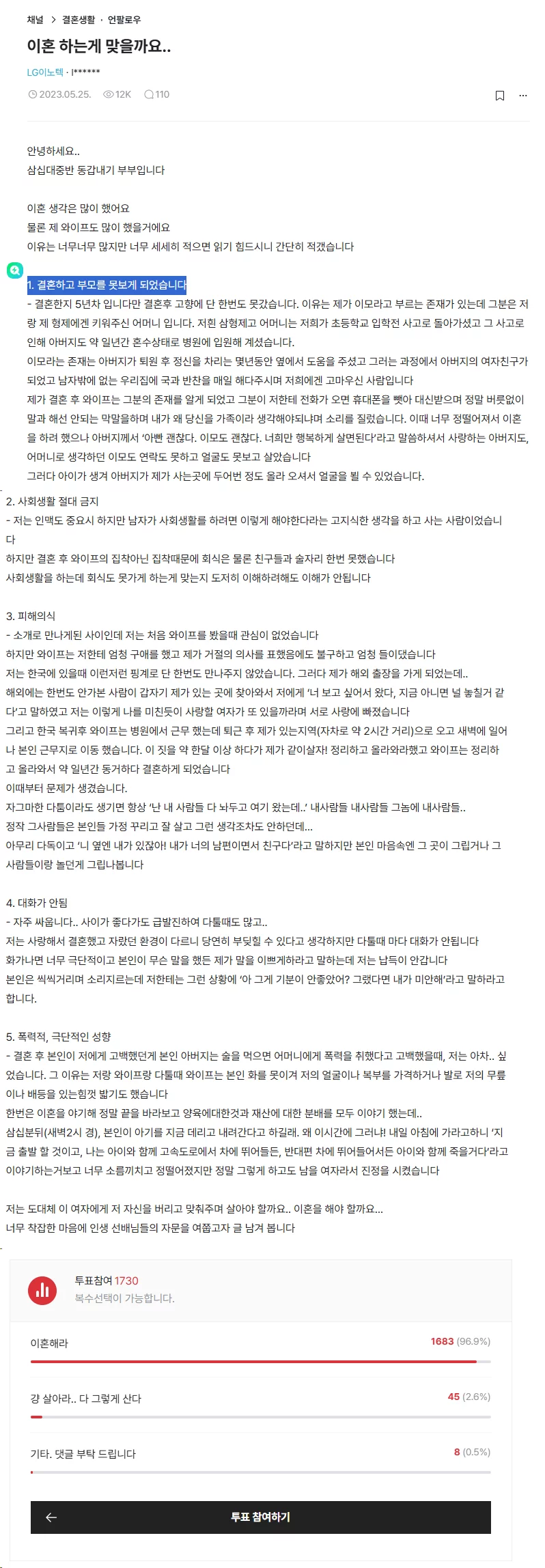 이혼 고민하는 블라인.blind 이키 이키님의 홈 전체게시물 아이디로 검색 이키님의 홈 전체게시물 아이디로 검색 2026-04-08 08:30 93 2 0 0 이전글 다음글 검색 목록 본문 본문 0 0 로그인 후 추천 또는 비추천하실 수 있습니다. 이전글 다음글 검색 목록 댓글목록2 먹짱전문님의 댓글 먹짱전문 먹짱전문님의 홈 전체게시물 아이디로 검색 먹짱전문님의 홈 전체게시물 아이디로 검색 2026-04-08 16:18 뷔페 입장 거절당했는데 집밥이 더 맛있는 케이스임 이거 0 0 뷔페 입장 거절당했는데 집밥이 더 맛있는 케이스임 이거 스포츠힘님의 댓글 스포츠힘 스포츠힘님의 홈 전체게시물 아이디로 검색 스포츠힘님의 홈 전체게시물 아이디로 검색 2026-04-08 18:47 이건 운동으로 치면 부상인데 참고 하면 더 크게 다치는 상황임 0 0 이건 운동으로 치면 부상인데 참고 하면 더 크게 다치는 상황임