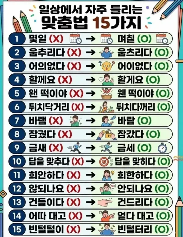 일상에서 자주틀리는 맞춤법 15가지 한입만 한입만님의 홈 전체게시물 아이디로 검색 한입만님의 홈 전체게시물 아이디로 검색 2026-04-10 08:48 79 3 0 0 이전글 다음글 검색 목록 본문 본문 0 0 로그인 후 추천 또는 비추천하실 수 있습니다. 이전글 다음글 검색 목록 댓글목록3 웃음초님의 댓글 웃음초 웃음초님의 홈 전체게시물 아이디로 검색 웃음초님의 홈 전체게시물 아이디로 검색 2026-04-10 11:33 맞춤법 틀리는 게 아니라 한국어가 너무 어려운 거임 0 0 맞춤법 틀리는 게 아니라 한국어가 너무 어려운 거임 시니컬임님의 댓글 시니컬임 시니컬임님의 홈 전체게시물 아이디로 검색 시니컬임님의 홈 전체게시물 아이디로 검색 2026-04-10 15:04 틀릴 땐 몰랐는데 보고 나니 더 헷갈림 0 0 틀릴 땐 몰랐는데 보고 나니 더 헷갈림 출근만님의 댓글 출근만 출근만님의 홈 전체게시물 아이디로 검색 출근만님의 홈 전체게시물 아이디로 검색 2026-04-10 16:44 회사 메신저 보면 여기 절반은 틀림ㅋㅋ 0 0 회사 메신저 보면 여기 절반은 틀림ㅋㅋ