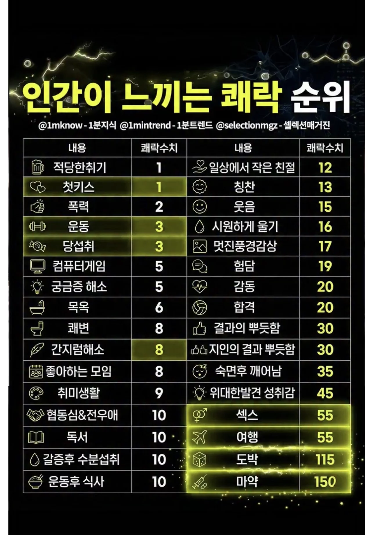 인간이 느끼는 쾌락 순위 검정윙 검정윙님의 홈 전체게시물 아이디로 검색 검정윙님의 홈 전체게시물 아이디로 검색 2026-04-10 18:41 65 0 0 0 이전글 다음글 검색 목록 본문 본문 왜? 사람들이 여행 유튜브에 열광하는지를알겠네요...간접적으로나마 도파민이 샘솟는느낌을 받나보군요 운동이 의외인데 운동후 식사가 더 쾌락감을준다는 사실에서 운동후 꼭 맛있는걸 먹어야겠다는... 0 0 로그인 후 추천 또는 비추천하실 수 있습니다. 이전글 다음글 검색 목록 댓글목록0 등록된 댓글이 없습니다.