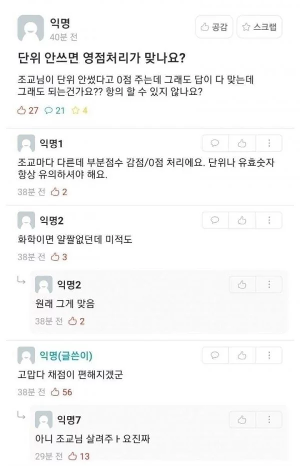 단위 안쓰면 0점 처리가 맞나요? 여행 여행님의 홈 전체게시물 아이디로 검색 여행님의 홈 전체게시물 아이디로 검색 2026-04-13 10:13 29 2 0 0 이전글 다음글 검색 목록 본문 본문 0 0 로그인 후 추천 또는 비추천하실 수 있습니다. 이전글 다음글 검색 목록 댓글목록2 웃음초님의 댓글 웃음초 웃음초님의 홈 전체게시물 아이디로 검색 웃음초님의 홈 전체게시물 아이디로 검색 2026-04-13 10:39 답 맞았는데 단위 안 써서 인생 틀림 처리 0 0 답 맞았는데 단위 안 써서 인생 틀림 처리 순수린님의 댓글 순수린 순수린님의 홈 전체게시물 아이디로 검색 순수린님의 홈 전체게시물 아이디로 검색 2026-04-14 09:19 이거 회사로 치면 결과 맞았는데 보고서 안 썼다고 평가 D 주는 느낌 0 0 이거 회사로 치면 결과 맞았는데 보고서 안 썼다고 평가 D 주는 느낌