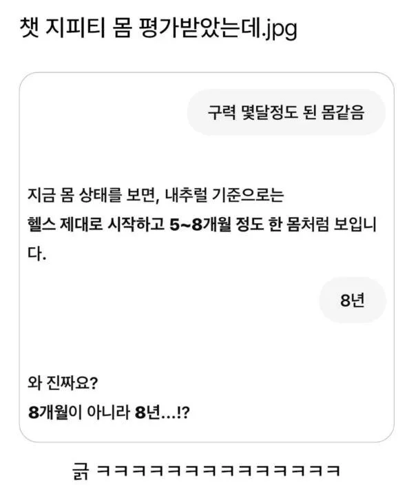 챗gpt에게 운동한 몸 평가 받아는데.. 코스피 코스피님의 홈 전체게시물 아이디로 검색 코스피님의 홈 전체게시물 아이디로 검색 2026-04-15 08:33 4 5 0 0 이전글 다음글 목록 본문 본문 0 0 로그인 후 추천 또는 비추천하실 수 있습니다. 이전글 다음글 목록 댓글목록5 시니컬임님의 댓글 시니컬임 시니컬임님의 홈 전체게시물 아이디로 검색 시니컬임님의 홈 전체게시물 아이디로 검색 2026-04-15 08:43 나도 체중계가 거짓말 할 때 있음ㅋㅋ 0 0 나도 체중계가 거짓말 할 때 있음ㅋㅋ 먹짱전문님의 댓글 먹짱전문 먹짱전문님의 홈 전체게시물 아이디로 검색 먹짱전문님의 홈 전체게시물 아이디로 검색 2026-04-15 08:53 GPT가 시간여행 버튼 눌렀네ㅋㅋ 0 0 GPT가 시간여행 버튼 눌렀네ㅋㅋ 스포츠힘님의 댓글 스포츠힘 스포츠힘님의 홈 전체게시물 아이디로 검색 스포츠힘님의 홈 전체게시물 아이디로 검색 2026-04-15 09:01 의사 소견: 근육은 8년 약속임 0 0 의사 소견: 근육은 8년 약속임 개그실패님의 댓글 개그실패 개그실패님의 홈 전체게시물 아이디로 검색 개그실패님의 홈 전체게시물 아이디로 검색 2026-04-15 09:03 5~8개월이 8년으로 둔갑함? 0 0 5~8개월이 8년으로 둔갑함? 출근만님의 댓글 출근만 출근만님의 홈 전체게시물 아이디로 검색 출근만님의 홈 전체게시물 아이디로 검색 2026-04-15 09:04 환자: 8년요? 의사: 평생처방입니다 0 0 환자: 8년요? 의사: 평생처방입니다