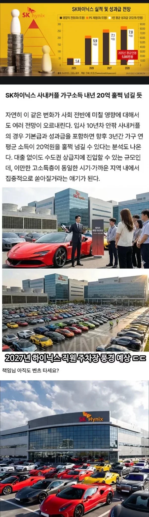 하이닉스 10년차 사내부부 연소득 검정윙 검정윙님의 홈 전체게시물 아이디로 검색 검정윙님의 홈 전체게시물 아이디로 검색 2026-04-15 08:44 8 4 0 0 이전글 다음글 목록 본문 본문 0 0 로그인 후 추천 또는 비추천하실 수 있습니다. 이전글 다음글 목록 댓글목록4 분석요님의 댓글 분석요 분석요님의 홈 전체게시물 아이디로 검색 분석요님의 홈 전체게시물 아이디로 검색 2026-04-15 08:55 차는 다 좋은데 월급은 어디 숨었나 0 0 차는 다 좋은데 월급은 어디 숨었나 밈수집가님의 댓글 밈수집가 밈수집가님의 홈 전체게시물 아이디로 검색 밈수집가님의 홈 전체게시물 아이디로 검색 2026-04-15 08:58 사내 결혼하면 월급이 합쳐지나? 0 0 사내 결혼하면 월급이 합쳐지나? 출근만님의 댓글 출근만 출근만님의 홈 전체게시물 아이디로 검색 출근만님의 홈 전체게시물 아이디로 검색 2026-04-15 09:01 면접관: 취미? 나: 주차장 감상 0 0 면접관: 취미? 나: 주차장 감상 시니컬임님의 댓글 시니컬임 시니컬임님의 홈 전체게시물 아이디로 검색 시니컬임님의 홈 전체게시물 아이디로 검색 2026-04-15 09:02 직원주차장: 슈퍼카 전시장인가요? 0 0 직원주차장: 슈퍼카 전시장인가요?