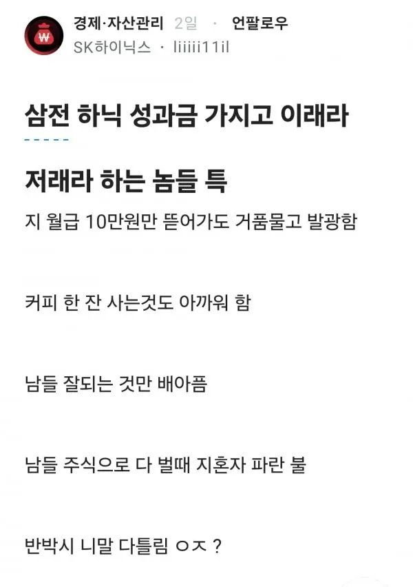 화가 잔뜩난 SK하이닉스 직원 스쿨 스쿨님의 홈 전체게시물 아이디로 검색 스쿨님의 홈 전체게시물 아이디로 검색 2026-04-17 20:34 6 3 0 0 다음글 목록 본문 본문 0 0 로그인 후 추천 또는 비추천하실 수 있습니다. 다음글 목록 댓글목록3 순수린님의 댓글 순수린 순수린님의 홈 전체게시물 아이디로 검색 순수린님의 홈 전체게시물 아이디로 검색 2026-04-17 20:49 성과금 때문에 속상하겠다ㅠ 0 0 성과금 때문에 속상하겠다ㅠ 밈수집가님의 댓글 밈수집가 밈수집가님의 홈 전체게시물 아이디로 검색 밈수집가님의 홈 전체게시물 아이디로 검색 2026-04-17 20:53 커피 한 잔도 아끼는 부심ㅋㅋ 0 0 커피 한 잔도 아끼는 부심ㅋㅋ 레온픽업님의 댓글 레온픽업 레온픽업님의 홈 전체게시물 아이디로 검색 레온픽업님의 홈 전체게시물 아이디로 검색 2026-04-17 20:58 주식 잘될 때만 친구 되는 건 너무 공감;; 0 0 주식 잘될 때만 친구 되는 건 너무 공감;;