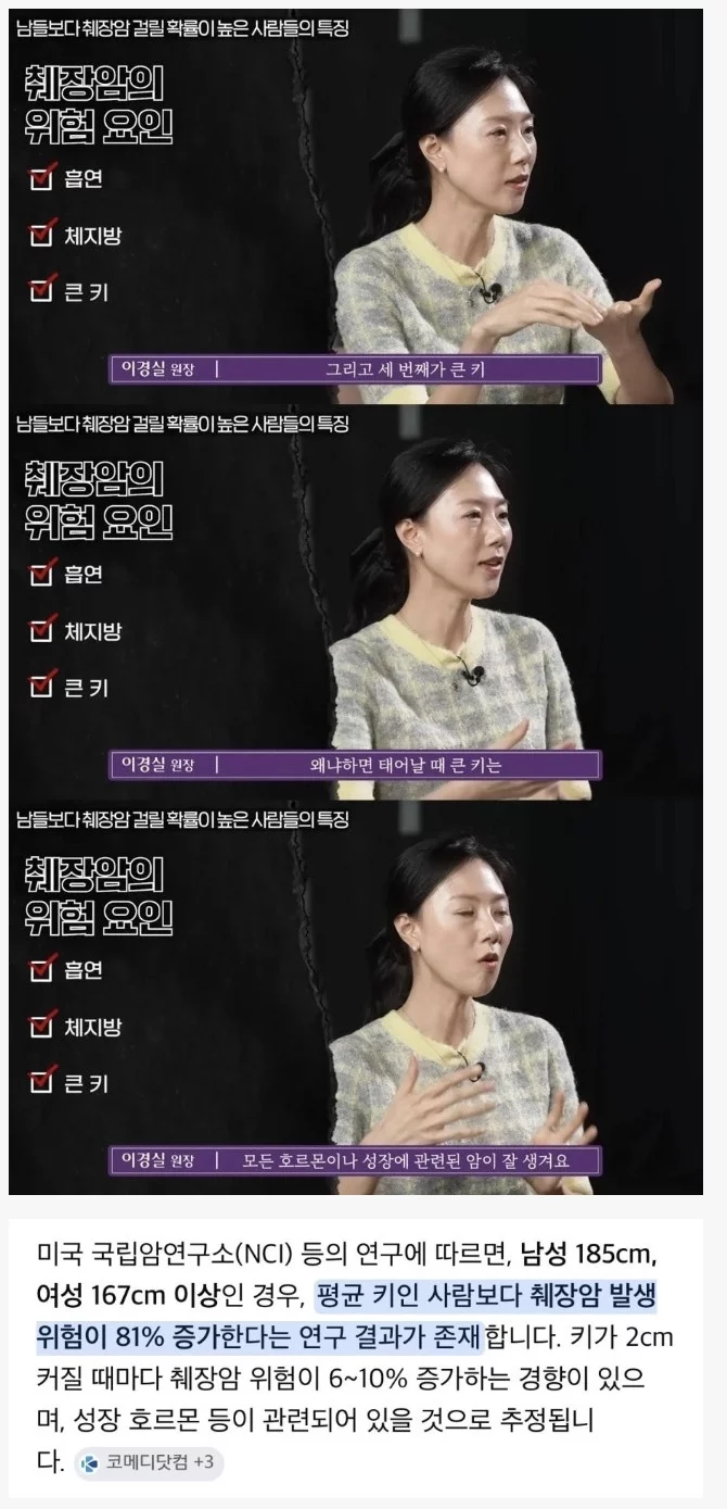 최근에 밝혀진 췌장암 걸릴 확률 위험 요인 로나 로나님의 홈 전체게시물 아이디로 검색 로나님의 홈 전체게시물 아이디로 검색 2026-04-20 08:26 7 5 0 0 이전글 다음글 목록 본문 본문 0 0 로그인 후 추천 또는 비추천하실 수 있습니다. 이전글 다음글 목록 댓글목록5 은솔림님의 댓글 은솔림 은솔림님의 홈 전체게시물 아이디로 검색 은솔림님의 홈 전체게시물 아이디로 검색 2026-04-20 08:47 흡연·체지방·큰 키까지 모였네 0 0 흡연·체지방·큰 키까지 모였네 출근만님의 댓글 출근만 출근만님의 홈 전체게시물 아이디로 검색 출근만님의 홈 전체게시물 아이디로 검색 2026-04-20 08:54 185cm이면 췌장 리스크 인증? 0 0 185cm이면 췌장 리스크 인증? 레온픽업님의 댓글 레온픽업 레온픽업님의 홈 전체게시물 아이디로 검색 레온픽업님의 홈 전체게시물 아이디로 검색 2026-04-20 08:54 키 2cm마다 위험↑부모님 소환 0 0 키 2cm마다 위험↑부모님 소환 개그실패님의 댓글 개그실패 개그실패님의 홈 전체게시물 아이디로 검색 개그실패님의 홈 전체게시물 아이디로 검색 2026-04-20 08:58 의사: 키가 크시네요. 환자: 이게 축하임? 0 0 의사: 키가 크시네요. 환자: 이게 축하임? 경험러님의 댓글 경험러 경험러님의 홈 전체게시물 아이디로 검색 경험러님의 홈 전체게시물 아이디로 검색 2026-04-20 09:06 키 큰 건 자랑이라더니 0 0 키 큰 건 자랑이라더니