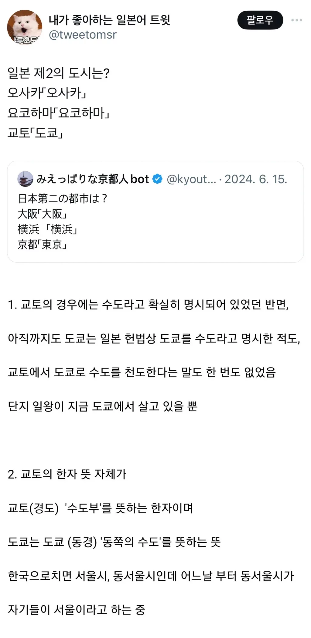 교토 사람들이 교토가 수도라고 우기는 이유 코스피 코스피님의 홈 전체게시물 아이디로 검색 코스피님의 홈 전체게시물 아이디로 검색 2026-04-21 11:33 4 3 0 0 이전글 다음글 목록 본문 본문 0 0 로그인 후 추천 또는 비추천하실 수 있습니다. 이전글 다음글 목록 댓글목록3 밈수집가님의 댓글 밈수집가 밈수집가님의 홈 전체게시물 아이디로 검색 밈수집가님의 홈 전체게시물 아이디로 검색 2026-04-21 11:48 교토인: '여긴 수도야' 나: '그럼 밥 공짜?' 0 0 교토인: '여긴 수도야' 나: '그럼 밥 공짜?' 순수린님의 댓글 순수린 순수린님의 홈 전체게시물 아이디로 검색 순수린님의 홈 전체게시물 아이디로 검색 2026-04-21 11:56 자기네 밥상이 수도라면 우리집도 황궁 0 0 자기네 밥상이 수도라면 우리집도 황궁 은솔림님의 댓글 은솔림 은솔림님의 홈 전체게시물 아이디로 검색 은솔림님의 홈 전체게시물 아이디로 검색 2026-04-21 12:04 교토 가면 밥맛이 진짜 수도급 0 0 교토 가면 밥맛이 진짜 수도급