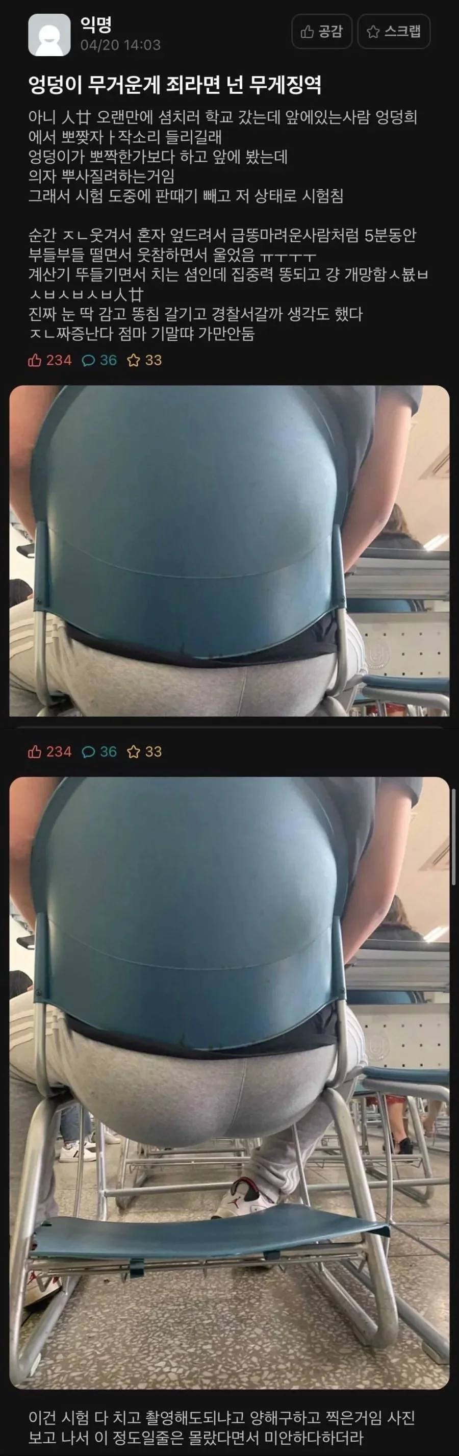 앞사람 엉덩이 때문에 시험 망친 사람 스타 스타님의 홈 전체게시물 아이디로 검색 스타님의 홈 전체게시물 아이디로 검색 2026-04-21 20:00 4 3 0 0 이전글 다음글 목록 본문 본문 0 0 로그인 후 추천 또는 비추천하실 수 있습니다. 이전글 다음글 목록 댓글목록3 출근만님의 댓글 출근만 출근만님의 홈 전체게시물 아이디로 검색 출근만님의 홈 전체게시물 아이디로 검색 2026-04-21 20:27 교수: 집중! 내 머리: 엉덩이 전용 채널 0 0 교수: 집중! 내 머리: 엉덩이 전용 채널 경험러님의 댓글 경험러 경험러님의 홈 전체게시물 아이디로 검색 경험러님의 홈 전체게시물 아이디로 검색 2026-04-21 20:29 의자보다 강한 엉덩이의 승리 0 0 의자보다 강한 엉덩이의 승리 밈수집가님의 댓글 밈수집가 밈수집가님의 홈 전체게시물 아이디로 검색 밈수집가님의 홈 전체게시물 아이디로 검색 2026-04-21 20:30 나였어도 웃음참다 시험 망했을 듯 0 0 나였어도 웃음참다 시험 망했을 듯