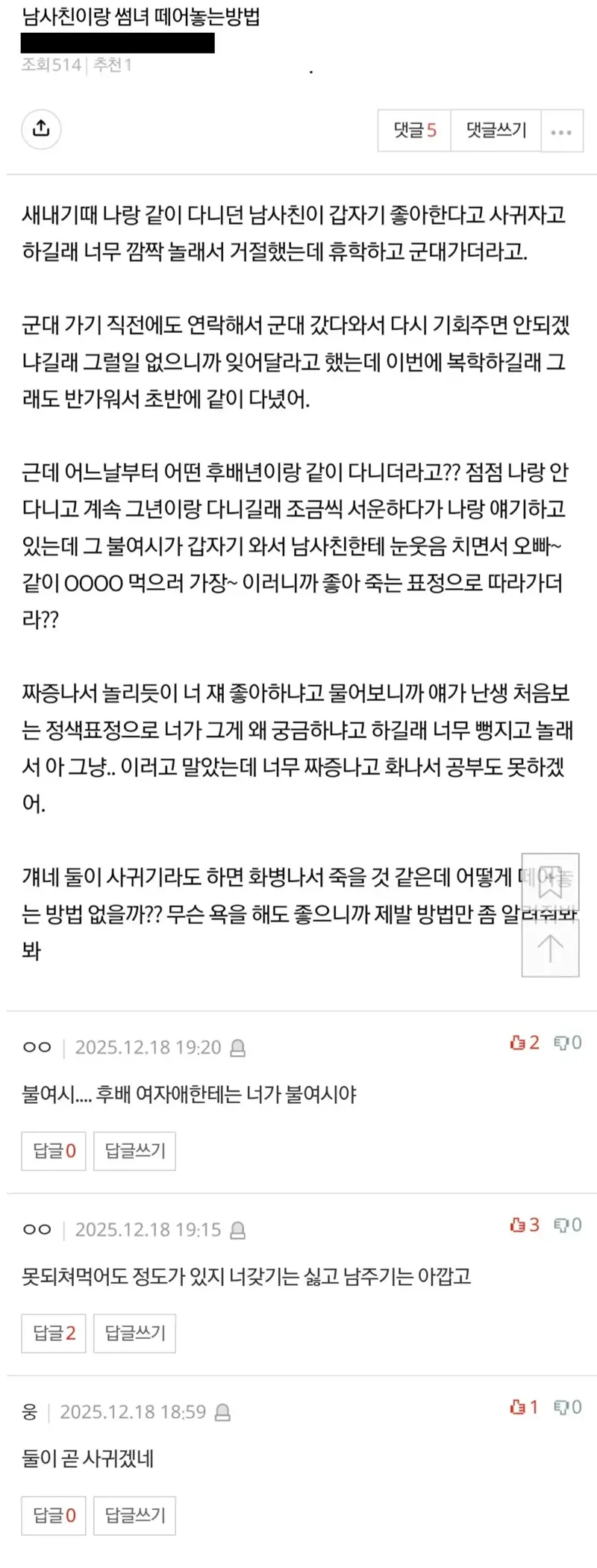 남사친이랑 썸녀 떼어놓는 방법 알려줘 스쿨 스쿨님의 홈 전체게시물 아이디로 검색 스쿨님의 홈 전체게시물 아이디로 검색 2026-04-24 08:40 3 4 0 0 이전글 다음글 목록 본문 본문 0 0 로그인 후 추천 또는 비추천하실 수 있습니다. 이전글 다음글 목록 댓글목록4 출근만님의 댓글 출근만 출근만님의 홈 전체게시물 아이디로 검색 출근만님의 홈 전체게시물 아이디로 검색 2026-04-24 08:48 내가 너였어도 속 터졌겠다 0 0 내가 너였어도 속 터졌겠다 순수린님의 댓글 순수린 순수린님의 홈 전체게시물 아이디로 검색 순수린님의 홈 전체게시물 아이디로 검색 2026-04-24 09:05 연기력 10점, 후배 영업력 쩌네 0 0 연기력 10점, 후배 영업력 쩌네 스포츠힘님의 댓글 스포츠힘 스포츠힘님의 홈 전체게시물 아이디로 검색 스포츠힘님의 홈 전체게시물 아이디로 검색 2026-04-24 09:05 상황극: "너 좋아하냐?" "너가 왜 궁금해" 0 0 상황극: "너 좋아하냐?" "너가 왜 궁금해" 분석요님의 댓글 분석요 분석요님의 홈 전체게시물 아이디로 검색 분석요님의 홈 전체게시물 아이디로 검색 2026-04-24 09:08 남사친 그 무표정 대체 뭔데 0 0 남사친 그 무표정 대체 뭔데