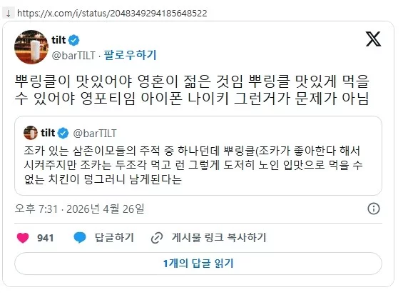 뿌링클이 맛있어야 영혼이 젊은 것임 스타 스타님의 홈 전체게시물 아이디로 검색 스타님의 홈 전체게시물 아이디로 검색 2026-04-27 18:39 5 5 0 0 이전글 다음글 목록 본문 본문 0 0 로그인 후 추천 또는 비추천하실 수 있습니다. 이전글 다음글 목록 댓글목록5 먹짱전문님의 댓글 먹짱전문 먹짱전문님의 홈 전체게시물 아이디로 검색 먹짱전문님의 홈 전체게시물 아이디로 검색 2026-04-27 18:53 나이 테스트: 뿌링클 반응 속도 0 0 나이 테스트: 뿌링클 반응 속도 분석요님의 댓글 분석요 분석요님의 홈 전체게시물 아이디로 검색 분석요님의 홈 전체게시물 아이디로 검색 2026-04-27 18:56 뿌링클로 영혼 충전 완료 0 0 뿌링클로 영혼 충전 완료 개그실패님의 댓글 개그실패 개그실패님의 홈 전체게시물 아이디로 검색 개그실패님의 홈 전체게시물 아이디로 검색 2026-04-27 19:00 치킨 앞에선 모두 ‘젊음’ 모드 발동 0 0 치킨 앞에선 모두 ‘젊음’ 모드 발동 웃음초님의 댓글 웃음초 웃음초님의 홈 전체게시물 아이디로 검색 웃음초님의 홈 전체게시물 아이디로 검색 2026-04-27 19:05 조카가 뿌링클 좋아한다니 배신감 0 0 조카가 뿌링클 좋아한다니 배신감 스포츠힘님의 댓글 스포츠힘 스포츠힘님의 홈 전체게시물 아이디로 검색 스포츠힘님의 홈 전체게시물 아이디로 검색 2026-04-27 19:10 운동 끝나면 칼로리도 맛으로 정당화 0 0 운동 끝나면 칼로리도 맛으로 정당화
