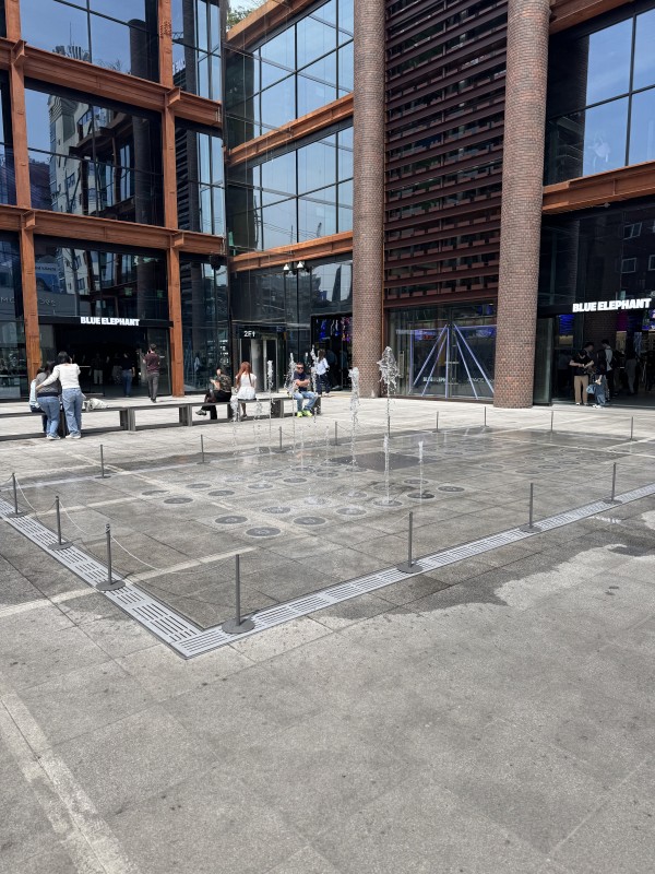 분수 나오고, 건물은 힙하고,