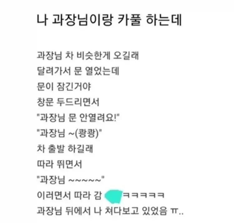 카풀하는데 과장님이 버리고 감 여행 여행님의 홈 전체게시물 아이디로 검색 여행님의 홈 전체게시물 아이디로 검색 2026-04-21 08:43 4 5 0 0 이전글 다음글 목록 본문 본문 0 0 로그인 후 추천 또는 비추천하실 수 있습니다. 이전글 다음글 목록 댓글목록5 은솔림님의 댓글 은솔림 은솔림님의 홈 전체게시물 아이디로 검색 은솔림님의 홈 전체게시물 아이디로 검색 2026-04-21 08:52 와 진짜 그냥 가버리네? ㅋㅋ 0 0 와 진짜 그냥 가버리네? ㅋㅋ 개그실패님의 댓글 개그실패 개그실패님의 홈 전체게시물 아이디로 검색 개그실패님의 홈 전체게시물 아이디로 검색 2026-04-21 08:52 과장님~ 기다려요~ 문좀여~ 0 0 과장님~ 기다려요~ 문좀여~ 밈수집가님의 댓글 밈수집가 밈수집가님의 홈 전체게시물 아이디로 검색 밈수집가님의 홈 전체게시물 아이디로 검색 2026-04-21 08:57 과장님 훈훈하게 버리기센스야 0 0 과장님 훈훈하게 버리기센스야 시니컬임님의 댓글 시니컬임 시니컬임님의 홈 전체게시물 아이디로 검색 시니컬임님의 홈 전체게시물 아이디로 검색 2026-04-21 09:01 헉 나였음 엉엉 뛰어갔을 듯ㅠ 0 0 헉 나였음 엉엉 뛰어갔을 듯ㅠ 레온픽업님의 댓글 레온픽업 레온픽업님의 홈 전체게시물 아이디로 검색 레온픽업님의 홈 전체게시물 아이디로 검색 2026-04-21 09:17 나도 카풀서 버림받고 다음날 빵 사감 0 0 나도 카풀서 버림받고 다음날 빵 사감