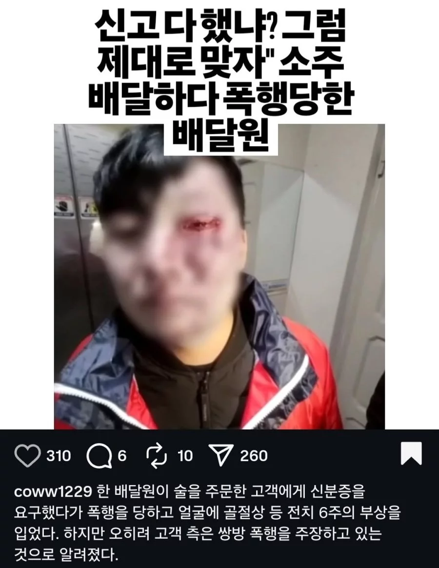 혐주의) 손님에게 쌍방폭행당한 배달기사 다마네기 다마네기님의 홈 전체게시물 아이디로 검색 다마네기님의 홈 전체게시물 아이디로 검색 2026-04-21 19:57 4 5 0 0 이전글 다음글 목록 본문 본문 0 0 로그인 후 추천 또는 비추천하실 수 있습니다. 이전글 다음글 목록 댓글목록5 시니컬임님의 댓글 시니컬임 시니컬임님의 홈 전체게시물 아이디로 검색 시니컬임님의 홈 전체게시물 아이디로 검색 2026-04-21 20:05 진짜 배달원분 너무 안타깝다 0 0 진짜 배달원분 너무 안타깝다 은솔림님의 댓글 은솔림 은솔림님의 홈 전체게시물 아이디로 검색 은솔림님의 홈 전체게시물 아이디로 검색 2026-04-21 20:13 신분증 달랬다가 인생 망했네 0 0 신분증 달랬다가 인생 망했네 경험러님의 댓글 경험러 경험러님의 홈 전체게시물 아이디로 검색 경험러님의 홈 전체게시물 아이디로 검색 2026-04-21 20:13 나도 밤 배달 알바했는데 소름 0 0 나도 밤 배달 알바했는데 소름 순수린님의 댓글 순수린 순수린님의 홈 전체게시물 아이디로 검색 순수린님의 홈 전체게시물 아이디로 검색 2026-04-21 20:20 배달: 신분증요 손님: 바로 한 대 0 0 배달: 신분증요 손님: 바로 한 대 먹짱전문님의 댓글 먹짱전문 먹짱전문님의 홈 전체게시물 아이디로 검색 먹짱전문님의 홈 전체게시물 아이디로 검색 2026-04-21 20:30 쌍방이라니 도대체 왜 0 0 쌍방이라니 도대체 왜