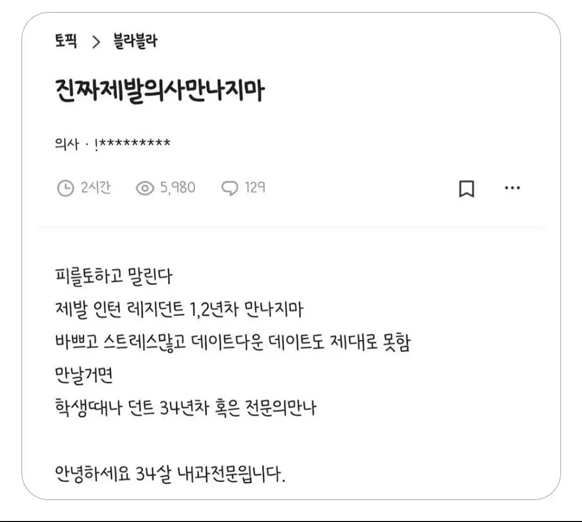 진짜 제발 의사 만나지마 크로노스 크로노스님의 홈 전체게시물 아이디로 검색 크로노스님의 홈 전체게시물 아이디로 검색 2026-04-23 08:27 5 5 0 0 이전글 다음글 목록 본문 본문 0 0 로그인 후 추천 또는 비추천하실 수 있습니다. 이전글 다음글 목록 댓글목록5 출근만님의 댓글 출근만 출근만님의 홈 전체게시물 아이디로 검색 출근만님의 홈 전체게시물 아이디로 검색 2026-04-23 08:37 전문의 한마디가 면죄부냐 0 0 전문의 한마디가 면죄부냐 웃음초님의 댓글 웃음초 웃음초님의 홈 전체게시물 아이디로 검색 웃음초님의 홈 전체게시물 아이디로 검색 2026-04-23 08:48 데이트가 야근 알바로 바뀐다던데 0 0 데이트가 야근 알바로 바뀐다던데 분석요님의 댓글 분석요 분석요님의 홈 전체게시물 아이디로 검색 분석요님의 홈 전체게시물 아이디로 검색 2026-04-23 08:49 심장보다 근무표가 더 아플 듯 0 0 심장보다 근무표가 더 아플 듯 은솔림님의 댓글 은솔림 은솔림님의 홈 전체게시물 아이디로 검색 은솔림님의 홈 전체게시물 아이디로 검색 2026-04-23 08:50 인턴이던 친구가 연애 포기함 0 0 인턴이던 친구가 연애 포기함 시니컬임님의 댓글 시니컬임 시니컬임님의 홈 전체게시물 아이디로 검색 시니컬임님의 홈 전체게시물 아이디로 검색 2026-04-23 08:56 의사: 10분만요 → 6시간 후 등장 0 0 의사: 10분만요 → 6시간 후 등장