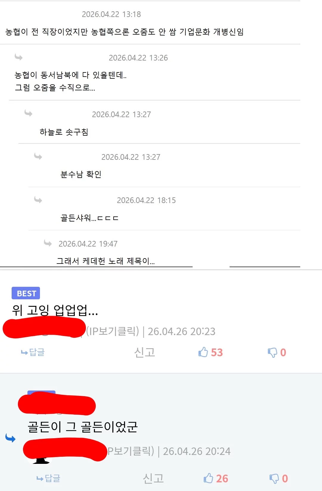 농협쪽으론 오줌도 안싼다는 농협 전직원 이키 이키님의 홈 전체게시물 아이디로 검색 이키님의 홈 전체게시물 아이디로 검색 2026-04-27 08:41 3 3 0 0 이전글 다음글 목록 본문 본문 0 0 로그인 후 추천 또는 비추천하실 수 있습니다. 이전글 다음글 목록 댓글목록3 시니컬임님의 댓글 시니컬임 시니컬임님의 홈 전체게시물 아이디로 검색 시니컬임님의 홈 전체게시물 아이디로 검색 2026-04-27 08:58 충성 끝판왕이네, 화장실도 출근계 0 0 충성 끝판왕이네, 화장실도 출근계 분석요님의 댓글 분석요 분석요님의 홈 전체게시물 아이디로 검색 분석요님의 홈 전체게시물 아이디로 검색 2026-04-27 09:15 오줌도 절약하는 농협 멤버십 혜택? 0 0 오줌도 절약하는 농협 멤버십 혜택? 순수린님의 댓글 순수린 순수린님의 홈 전체게시물 아이디로 검색 순수린님의 홈 전체게시물 아이디로 검색 2026-04-27 09:15 면접관: 화장실은요? 지원자: 충성으로 대체 0 0 면접관: 화장실은요? 지원자: 충성으로 대체