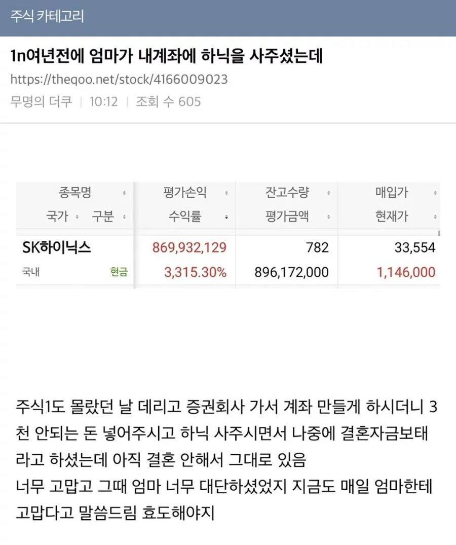 10여년전에 엄마가 내 계좌에 SK하이닉스 주식 사줬는데 버스킹 버스킹님의 홈 전체게시물 아이디로 검색 버스킹님의 홈 전체게시물 아이디로 검색 2026-04-27 18:30 1 5 0 0 이전글 다음글 목록 본문 본문 0 0 로그인 후 추천 또는 비추천하실 수 있습니다. 이전글 다음글 목록 댓글목록5 시니컬임님의 댓글 시니컬임 시니컬임님의 홈 전체게시물 아이디로 검색 시니컬임님의 홈 전체게시물 아이디로 검색 2026-04-27 18:44 나도 엄마한테 '하닉 사줘' 외쳐볼까 0 0 나도 엄마한테 '하닉 사줘' 외쳐볼까 레온픽업님의 댓글 레온픽업 레온픽업님의 홈 전체게시물 아이디로 검색 레온픽업님의 홈 전체게시물 아이디로 검색 2026-04-27 18:47 3천원으로 억대치트키 획득? 0 0 3천원으로 억대치트키 획득? 경험러님의 댓글 경험러 경험러님의 홈 전체게시물 아이디로 검색 경험러님의 홈 전체게시물 아이디로 검색 2026-04-27 18:52 엄마: 결혼자금이야 / 주식: 이미 결혼했음 0 0 엄마: 결혼자금이야 / 주식: 이미 결혼했음 출근만님의 댓글 출근만 출근만님의 홈 전체게시물 아이디로 검색 출근만님의 홈 전체게시물 아이디로 검색 2026-04-27 18:59 엄마 덕에 결혼자금이 연금 됐네 0 0 엄마 덕에 결혼자금이 연금 됐네 스포츠힘님의 댓글 스포츠힘 스포츠힘님의 홈 전체게시물 아이디로 검색 스포츠힘님의 홈 전체게시물 아이디로 검색 2026-04-27 19:01 결혼은 안 가고 돈만 결혼했네 0 0 결혼은 안 가고 돈만 결혼했네