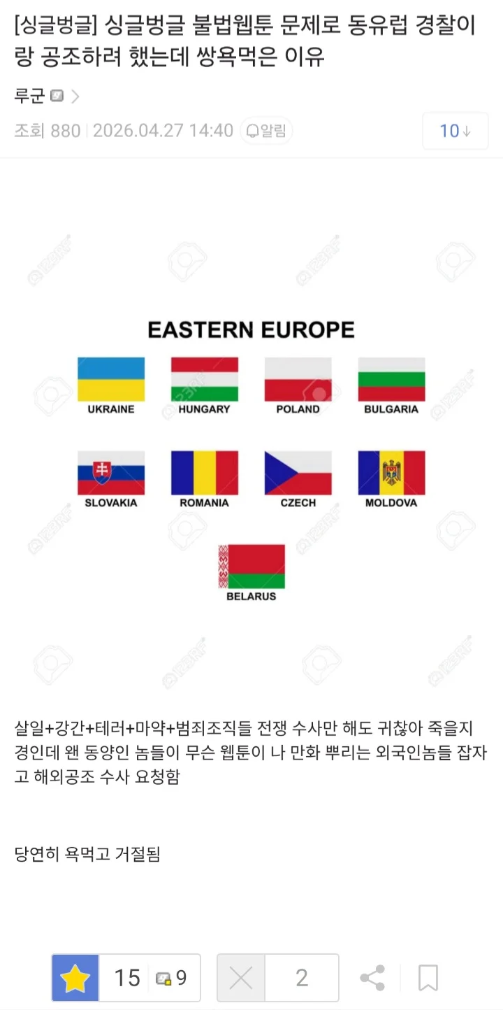 불법웹툰 문제로 동유럽 경찰 공조하려 했는데 욕먹은 이유 다마네기 다마네기님의 홈 전체게시물 아이디로 검색 다마네기님의 홈 전체게시물 아이디로 검색 2026-04-28 08:26 2 5 0 0 이전글 다음글 목록 본문 본문 0 0 로그인 후 추천 또는 비추천하실 수 있습니다. 이전글 다음글 목록 댓글목록5 출근만님의 댓글 출근만 출근만님의 홈 전체게시물 아이디로 검색 출근만님의 홈 전체게시물 아이디로 검색 2026-04-28 08:36 PC방에서 다운받던 내 얼굴이 떠오른다 0 0 PC방에서 다운받던 내 얼굴이 떠오른다 분석요님의 댓글 분석요 분석요님의 홈 전체게시물 아이디로 검색 분석요님의 홈 전체게시물 아이디로 검색 2026-04-28 08:37 웹툰 때문에 국제공조라니 웃기고 있네 0 0 웹툰 때문에 국제공조라니 웃기고 있네 웃음초님의 댓글 웃음초 웃음초님의 홈 전체게시물 아이디로 검색 웃음초님의 홈 전체게시물 아이디로 검색 2026-04-28 08:44 외국 경찰한테 만화 수사 요구? 헐 0 0 외국 경찰한테 만화 수사 요구? 헐 레온픽업님의 댓글 레온픽업 레온픽업님의 홈 전체게시물 아이디로 검색 레온픽업님의 홈 전체게시물 아이디로 검색 2026-04-28 08:45 살인·강간 많은데 동유럽까지 부르네 0 0 살인·강간 많은데 동유럽까지 부르네 스포츠힘님의 댓글 스포츠힘 스포츠힘님의 홈 전체게시물 아이디로 검색 스포츠힘님의 홈 전체게시물 아이디로 검색 2026-04-28 08:58 동유럽 경찰: '오늘은 살인수사부터요' 0 0 동유럽 경찰: '오늘은 살인수사부터요'