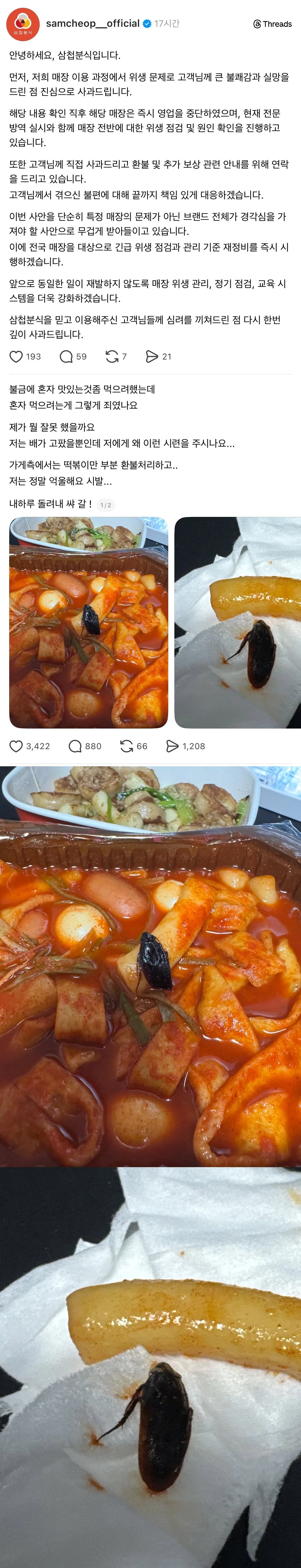 혐주의) 삼첩분식 사과문 스타 스타님의 홈 전체게시물 아이디로 검색 스타님의 홈 전체게시물 아이디로 검색 2026-04-28 08:31 2 5 0 0 이전글 다음글 목록 본문 본문 0 0 로그인 후 추천 또는 비추천하실 수 있습니다. 이전글 다음글 목록 댓글목록5 출근만님의 댓글 출근만 출근만님의 홈 전체게시물 아이디로 검색 출근만님의 홈 전체게시물 아이디로 검색 2026-04-28 08:43 떡볶이에서 바퀴벌레가 먼저 인사했네 0 0 떡볶이에서 바퀴벌레가 먼저 인사했네 레온픽업님의 댓글 레온픽업 레온픽업님의 홈 전체게시물 아이디로 검색 레온픽업님의 홈 전체게시물 아이디로 검색 2026-04-28 08:48 나도 한입 먹다 멈칫 소름 돋겠다 0 0 나도 한입 먹다 멈칫 소름 돋겠다 분석요님의 댓글 분석요 분석요님의 홈 전체게시물 아이디로 검색 분석요님의 홈 전체게시물 아이디로 검색 2026-04-28 08:56 와 그 순간 식욕이 싹 사라졌겠다 0 0 와 그 순간 식욕이 싹 사라졌겠다 시니컬임님의 댓글 시니컬임 시니컬임님의 홈 전체게시물 아이디로 검색 시니컬임님의 홈 전체게시물 아이디로 검색 2026-04-28 09:03 사장: 위생최우선 / 바퀴: 초대받음 0 0 사장: 위생최우선 / 바퀴: 초대받음 개그실패님의 댓글 개그실패 개그실패님의 홈 전체게시물 아이디로 검색 개그실패님의 홈 전체게시물 아이디로 검색 2026-04-28 09:05 브랜드 이미지가 떡볶이보다 더 타버렸네 0 0 브랜드 이미지가 떡볶이보다 더 타버렸네