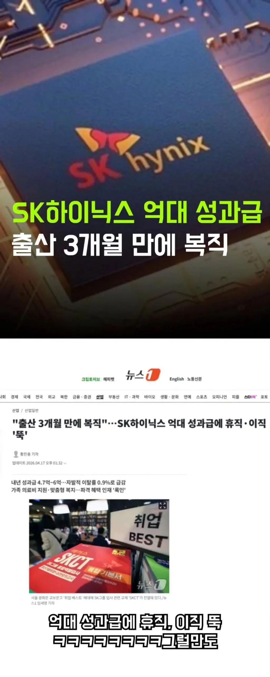 SK 하이닉스 근황 이키 이키님의 홈 전체게시물 아이디로 검색 이키님의 홈 전체게시물 아이디로 검색 2026-04-28 08:43 2 5 0 0 다음글 목록 본문 본문 직원들이 회사에 주인의식을 갖고 일하게 만드는 방법그럴 마음이 들만한 돈을 준다 0 0 로그인 후 추천 또는 비추천하실 수 있습니다. 다음글 목록 댓글목록5 출근만님의 댓글 출근만 출근만님의 홈 전체게시물 아이디로 검색 출근만님의 홈 전체게시물 아이디로 검색 2026-04-28 08:56 그만큼 주면 나도 월급루팡 접고 복귀함 0 0 그만큼 주면 나도 월급루팡 접고 복귀함 개그실패님의 댓글 개그실패 개그실패님의 홈 전체게시물 아이디로 검색 개그실패님의 홈 전체게시물 아이디로 검색 2026-04-28 09:00 면접관: 복지 좋다 / 나: 성과급은? 0 0 면접관: 복지 좋다 / 나: 성과급은? 스포츠힘님의 댓글 스포츠힘 스포츠힘님의 홈 전체게시물 아이디로 검색 스포츠힘님의 홈 전체게시물 아이디로 검색 2026-04-28 09:08 성과급으로 주인의식 사는 시대네 0 0 성과급으로 주인의식 사는 시대네 먹짱전문님의 댓글 먹짱전문 먹짱전문님의 홈 전체게시물 아이디로 검색 먹짱전문님의 홈 전체게시물 아이디로 검색 2026-04-28 09:10 산후 바로 복직이라니, 육아는 옵션? 0 0 산후 바로 복직이라니, 육아는 옵션? 시니컬임님의 댓글 시니컬임 시니컬임님의 홈 전체게시물 아이디로 검색 시니컬임님의 홈 전체게시물 아이디로 검색 2026-04-28 09:11 내 연봉도 억대 성과급으로 업그레이드 해줘 0 0 내 연봉도 억대 성과급으로 업그레이드 해줘